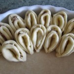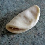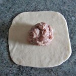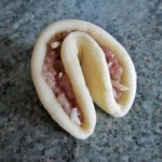 İç malzemede listedeki gibi hazırlanır.. Hamur iki eşit parçaya bölündükten sonra bir kısmı bir köşede bekletilir diğer parça 3- 3-4 cm boyunda açılır ve yuvarlak ağızlı bir bardak tarzı şeyle kesilir.. Yuvarlakların içi iç malzeme ile doldurulur..